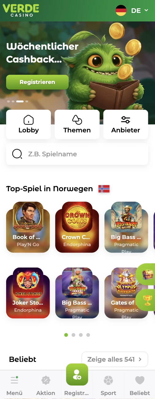 Bei Verdecasino Casino wird Ihr Konto geräteübergreifend synchronisiert, sodass Einstellungen und Wallet beim Wechsel vom Desktop aufs Handy übereinstimmen. Verdecasino nutzt auf Mobilgeräten dieselben Spieleanbieter, darunter NetEnt, Pragmatic Play, Playtech, Quickspin, Yggdrasil, Evolution Gaming, Amatic, Betsoft, Nolimit City und Microgaming. Der RTP wird pro Spiel angezeigt, damit Sie die Werte vor dem Einsatz prüfen können, etwa Sweet Bonanza (95.52%), Luck of Tiger (96.09%) oder Book of Ra Magic (95.1%).